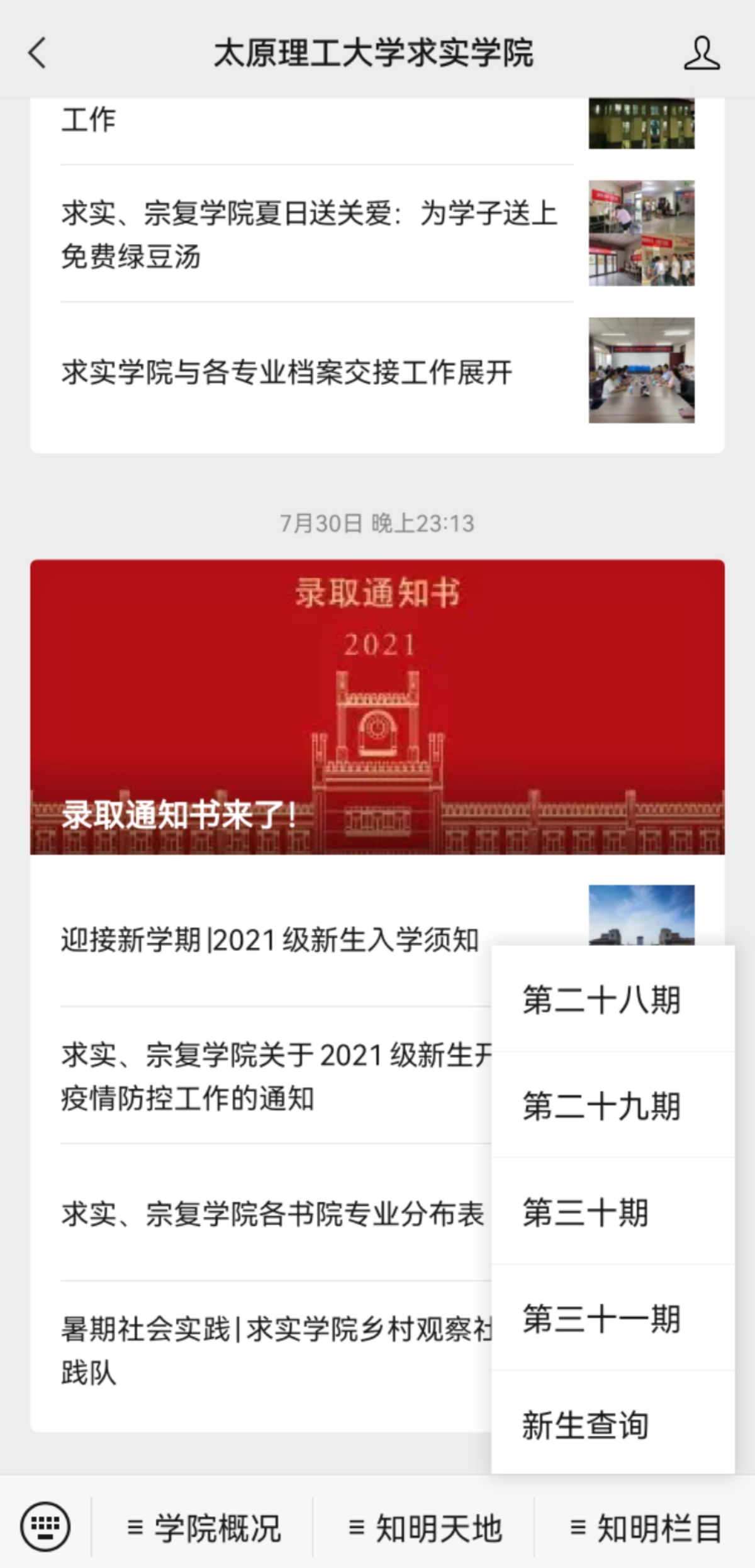 步骤二:在“知明栏目”栏最下方点击“新生查询”进入查询页面。