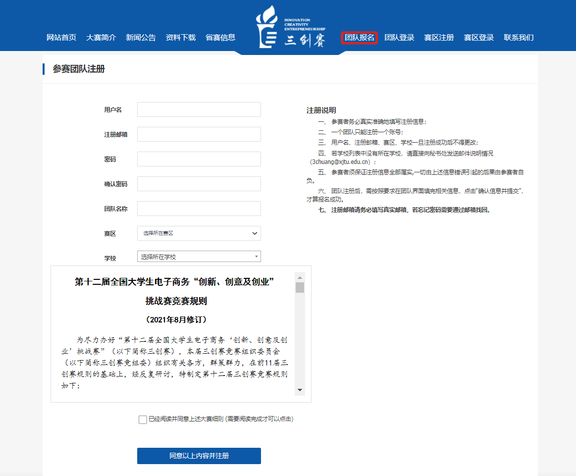 参赛队报名:参赛队伍到官方网站(www.3chuang.net)上统一注册(由队长注册),以便规范管理和提供必要的服务。报名时首先选择所在省份及(已经注册并审核通过的)公司并填写参赛队员、高校指导老师情况、企业指导老师情况,参赛作品名可以在报名时间截止前确定。之后:所有参赛队伍必须由本校三创赛承办负责人在官网上对参赛队伍进行审核通过后才视为有效报名团队。