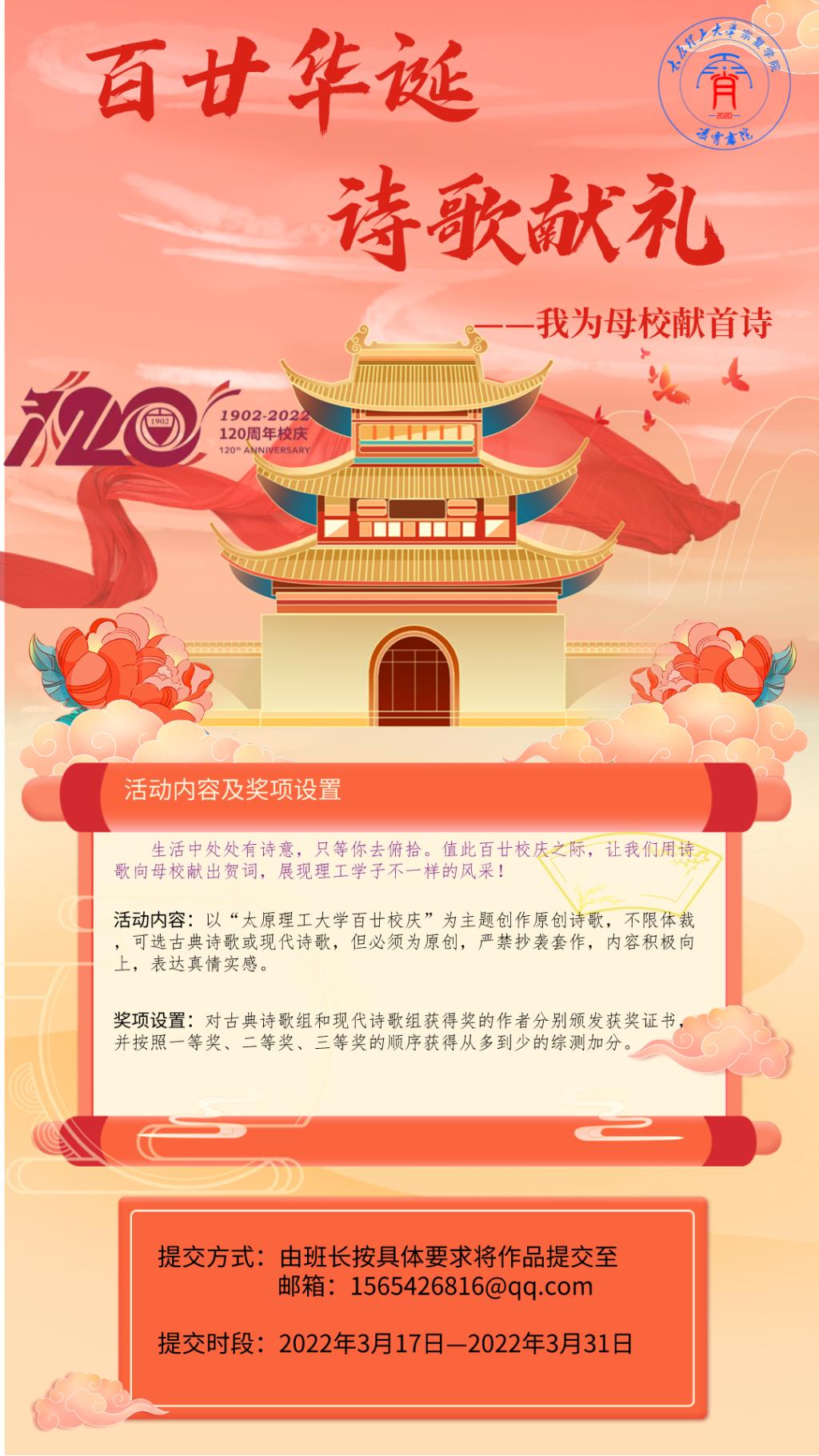 百廿校庆,筚路蓝缕。百廿载的风雨沧桑,百廿载的发展成就,凝聚着几代教育工作者的心血,培养了一批批栋梁之才。诗词是我国民族文化的精髓代表,在公司一百二十周年校庆来临之际,为彰显办学特色,提升办学品位,促进公司发展,激发学习、积累诗词的兴趣,弘扬民族文化,提高员工的欣赏品味以及审美情趣,太阳成集团tyc122ccvip求实、宗复公司特举办“为太理百廿校庆献诗”活动。诗,是人对世界的情感表达,也是内心的外化,望同学们在此次活动中展现自我才华,在这120周年校庆之时留下浓墨重彩的一笔,在点燃对诗词的热情的同时抒发对公司的百年芳华的情怀。