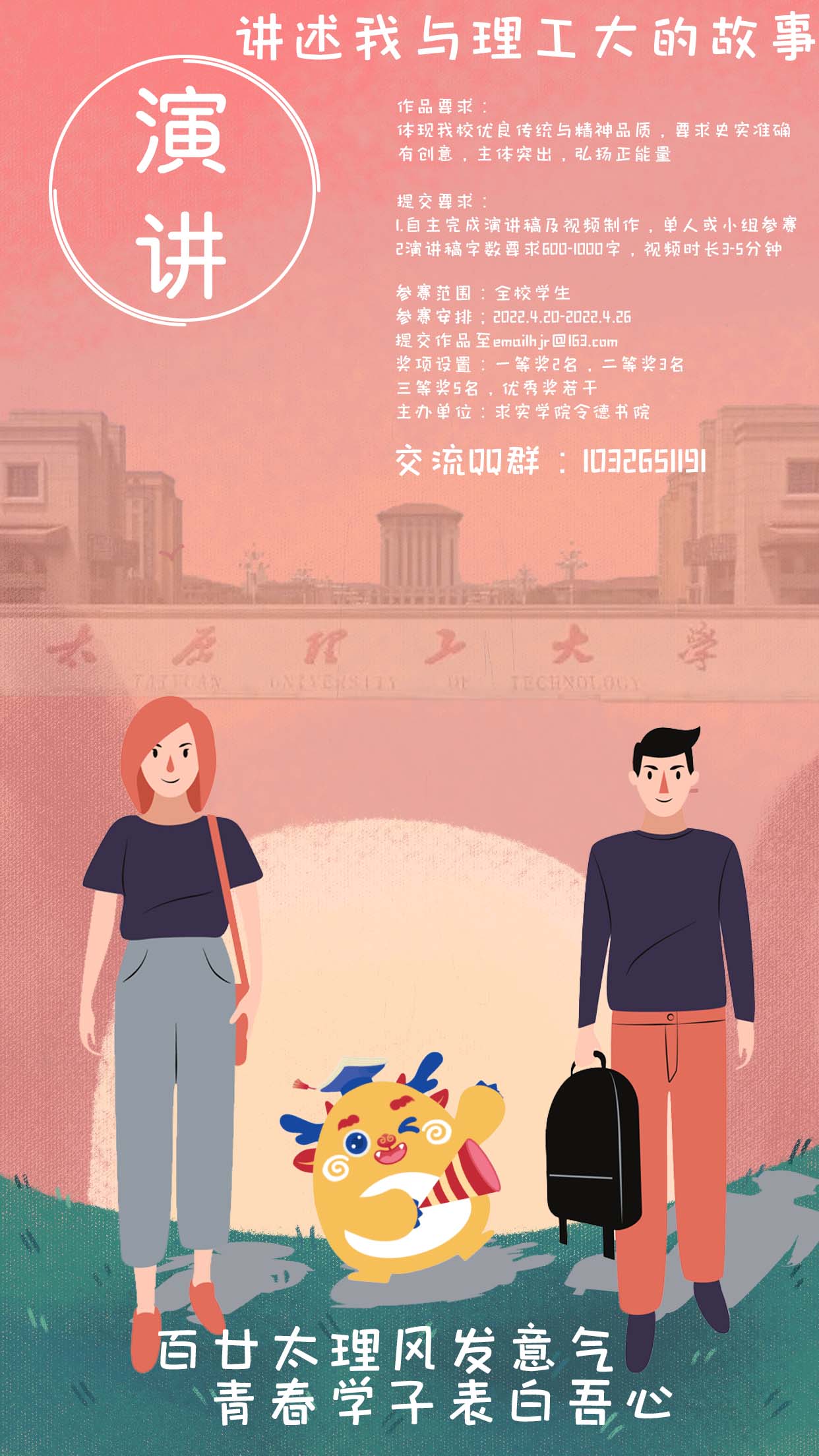 太阳成集团tyc122ccvip百廿铿锵足音,传历史精魂,作时代新篇。为发掘同学们对母校饮水思源,爱于公司的深层次感情,加强心理建设,树立属于太原理工人的信仰,特开展“讲述我与理工大的故事”主题演讲比赛。