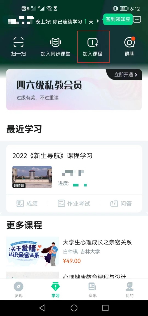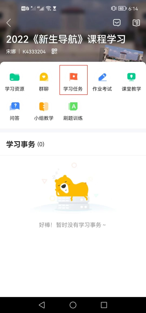2、登录“知到”APP,点击底部【学习】界面→点击顶部中间的【加入课程】→输入课程号4333204→进入《新生导航》课程学习界面→点击“学习任务”,在规定时间内完成课程学习和考试。