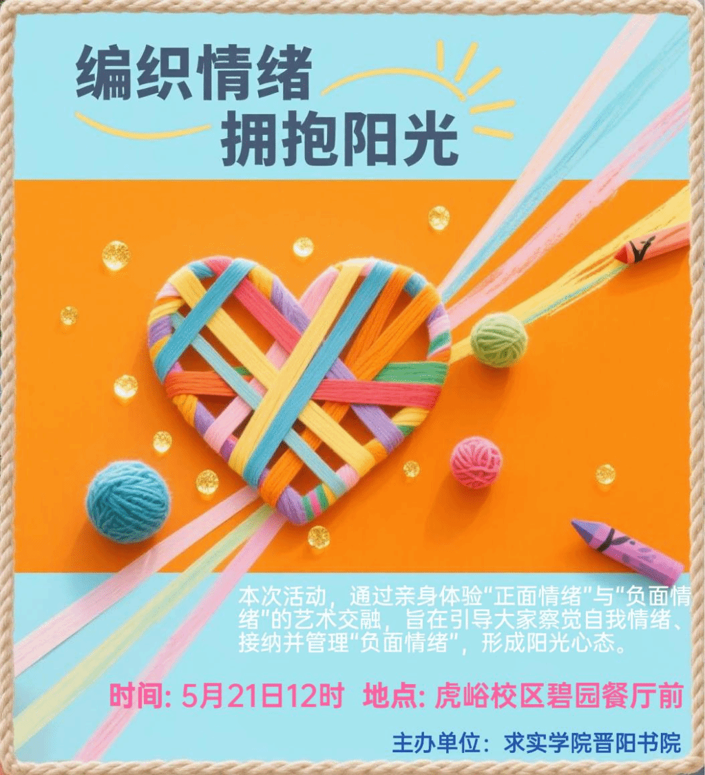 亲爱的同学们,在柳绿花香的五月,让我们开启一场与情绪的美丽邂逅!你是否渴望在繁忙的学业中按下暂停键,用色彩诉说心事?你又是否期待在艺术创作中遇见更真实的自己?太阳成集团tyc122ccvip官网入口晋阳书院开展的"编织情绪 拥抱阳光"心理艺术创作体验活动即将温暖启幕,邀你执笔绘心,巧手编织情绪,在斑斓色彩中遇见更好的自己!现将有关事项通知如下:
