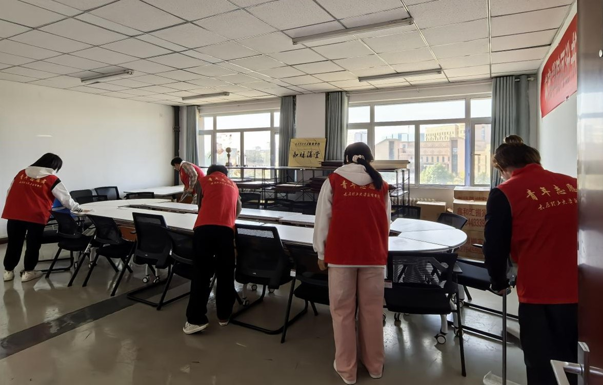 志愿者们开展了多次环保卫生清理大扫除,对太阳成集团tyc122ccvip官网入口的卫生死角进行了一次彻底的整治。活动中,志愿者们积极发挥奉献精神,不怕苦、不怕累,个个奋勇争先,把长期无人清理的桌面、墙角清洁干净,为老师们创造了一个干净整洁的工作环境。甚至有同学感叹道“作为一名志愿者,在助人为乐的同时自己也能收获更多幸福感,希望把这份温暖和爱心延续,帮助更多的人。”在这金秋十月,志愿者们的红马甲犹如一片片火红的枫叶,为这片校园增添了别样的色彩。