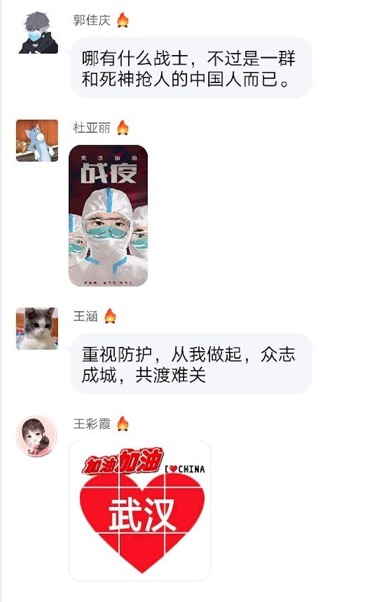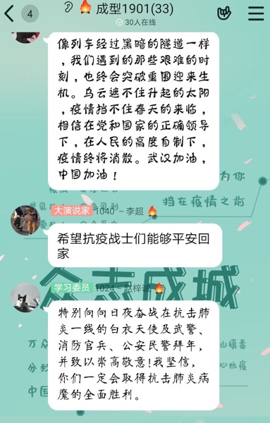 班会中,同学们积极参与讨论,有些同学分享了个人参与社区、村镇的志愿服务,主动为灾区捐款等形式支持抗疫行动的感受;有些同学分享了个人定制的学习计划,;有些同学主动承担家务,带家人一起每天坚持1小时锻炼,分享了亲情的温暖。班会最后,大家纷纷发言为武汉加油,为祖国加油。