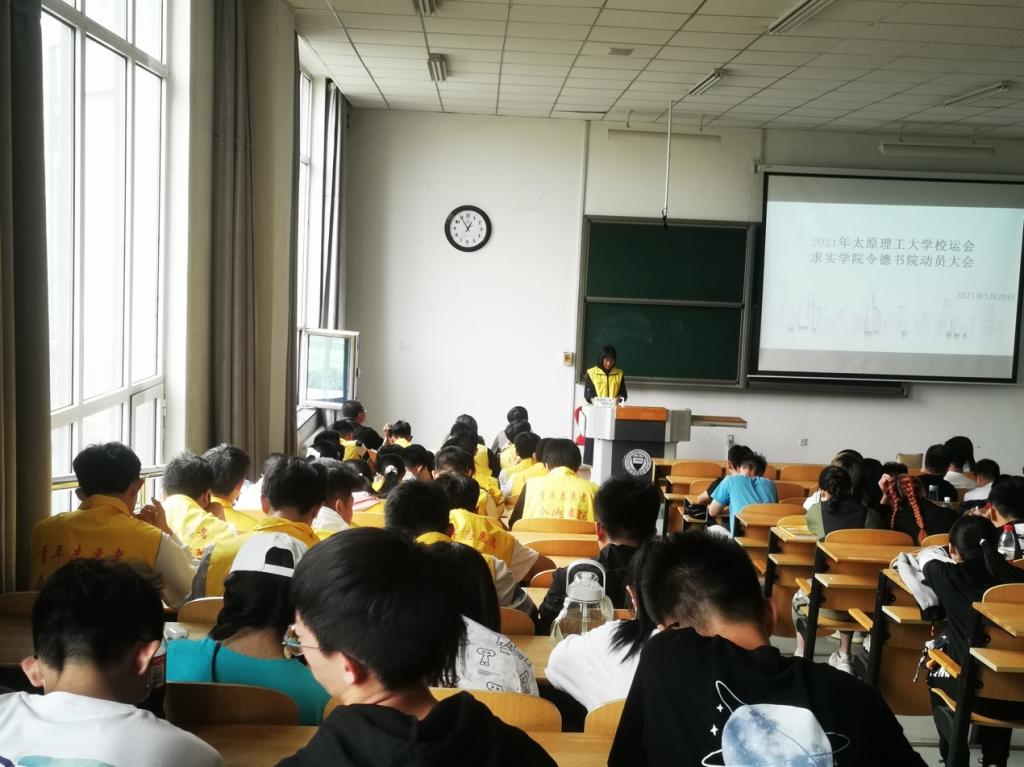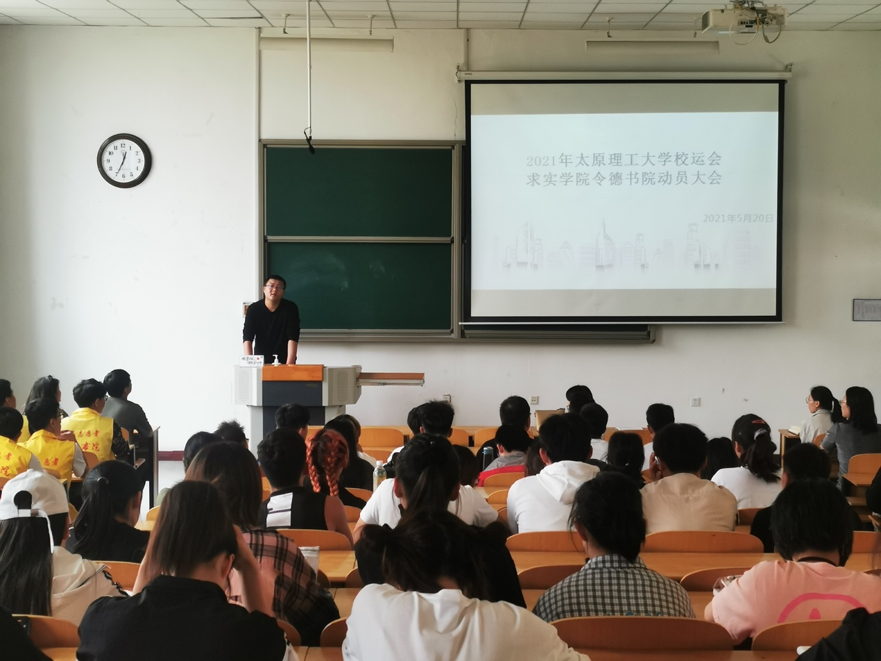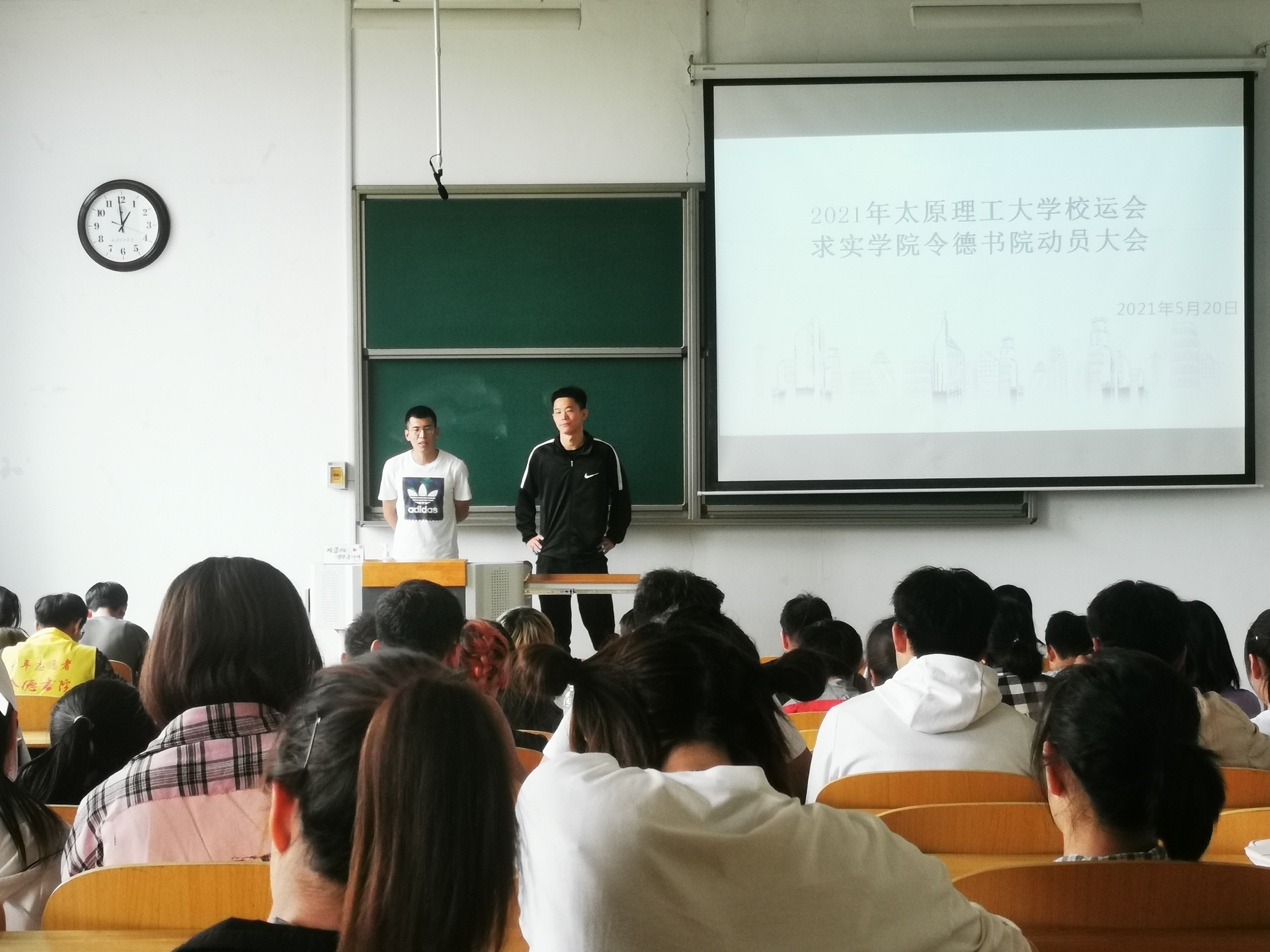 2020年5月20日中午12点30分,由求实公司令德书院主办的校运动会动员大会在太阳成集团tyc122ccvip明向校区行思楼B-118举行。太阳成集团tyc122ccvip官网入口经理、宗复公司副经理宋燕教授出席了本次会议,令徳书院全体老师、全体运动员、志愿者代表、员工代表,体育公司训练教练参加了此次会议,李瑞波主持会议。