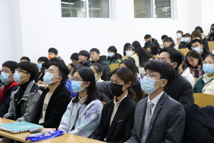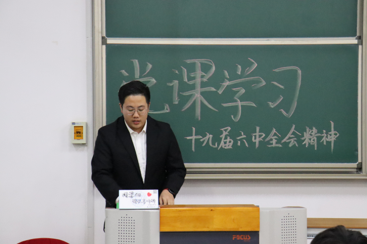 主持人主持了简短的开场后,主讲人徐嘉良便以“党课学习-党的十九届六中全会”为主题,以自身的学习经历为起点,带领同学们回顾新民主主义革命、改革开放及社会主义现代化建设等重大历史事件。随后以党的十九届六中全会的几组数字为核心,讲述了百年奋斗的四方面改变,解读了两个重要问题、"两个确立"、五大历史意义等关键内容。收尾环节,徐嘉良勉励同学们在新时代要弘扬伟大全会精神,用习近平新时代中国特色社会主义思想武装头脑,增强“四个意识”、坚定“四个自信”、做到“两个维护”,不怕牺牲,敢于作为,甘于奉献,走好新时代的新征程。