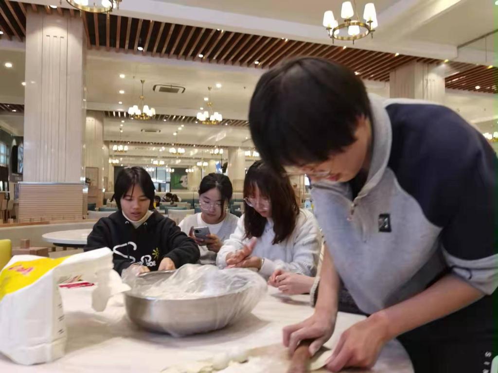 活动开始,大家激情高涨,分工准备包饺子的材料,有人负责和面,有人负责洗菜切菜,也有人负责馅料准备等。调制馅料对于没有经验的大一员工可是一件不好处理的事情,同学们积极利用网络平台搜索调制馅料的方法,在抖音,B站等媒体平台上找适合自己的方法,对此,光信2103班的柳崇智同学甚至还想到了打电话求助父母,了解了自己家平日调制馅料的流程。一切准备工作就绪后,同学们分坐在几个圆桌旁边,两桌负责擀皮,其他桌开始包饺子,形态各异的饺子逐渐出现在北餐的饭桌上,周围的食堂打饭阿姨也深深被此吸引,参与了进来。“你看,我的这个包的像个宝子!”“我这个捏的皮薄肉厚!”同学们在圆桌旁开始了合作包饺子,互相谈论着。“今年过年回家,我一定要跟家里人一起包饺子,现在让我先好好学学!”最西边的一桌上的同学叫道。