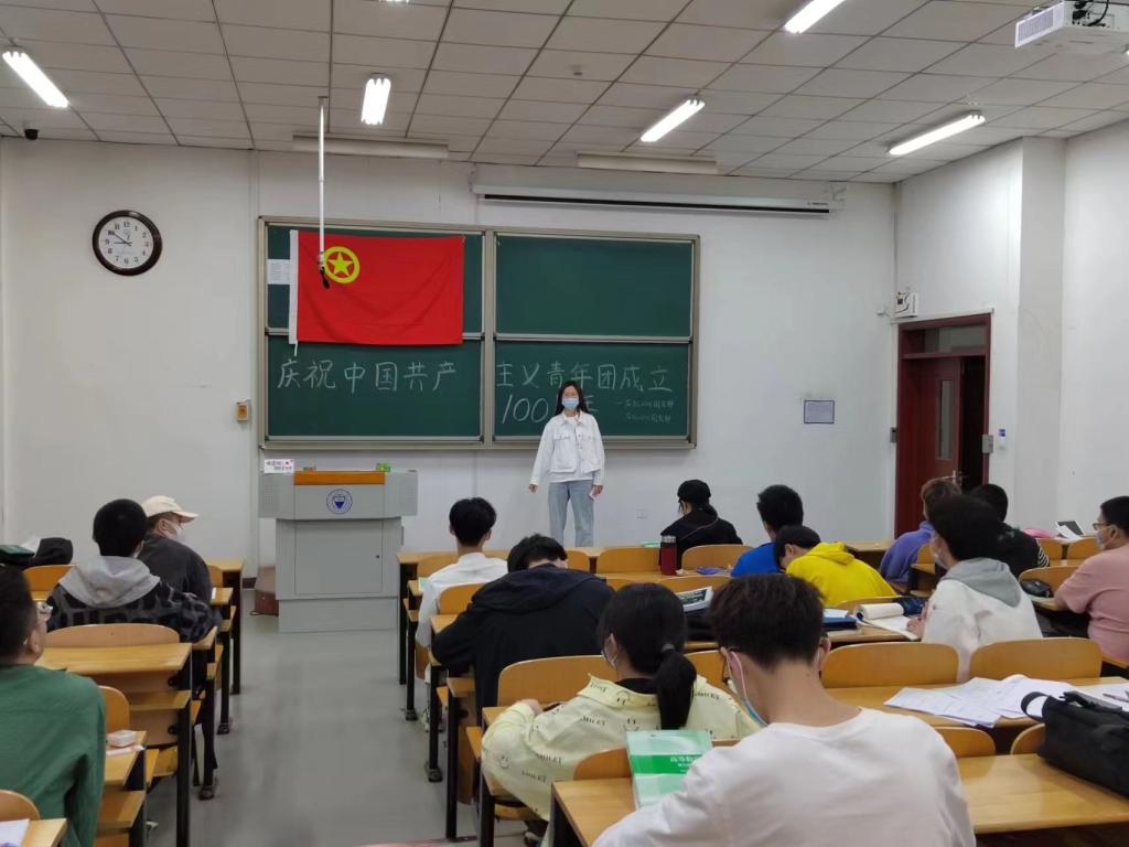 本次献礼建团百年主题团日活动分为三个部分。4月24日上午,应化专业两个团支部全体团员青年一起来到明向校区的标志性地点,与安全、精化专业团支部联合以视频拍摄的形式为共青团送上最真挚的祝福。下午,在两位团支书的带领下,通过“红色剧本杀”让同学们了解党领导的百年中国青年运动的光辉历史,同学们通过《百年风华》这部红色剧本,在玩中学习和体悟,把苦难辉煌的过去、日新月异的现在、光明宏大的未来贯通起来,加深了对党史学习教育的兴趣,厚植了爱国主义情怀,增强了对国家和民族的认同感、责任感和使命感。晚上,全体团员青年齐聚在教室里,悬挂起团旗,团支书先对本次主题团日活动进行了总结,同学们也分享了自己的感悟与体会。最后,大家一起重温入团誓词,齐唱团歌,再次为建团百年表达诚挚的祝福。