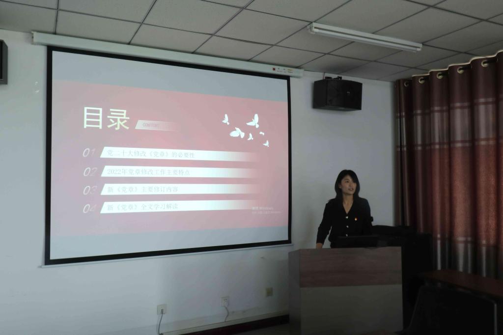 史昭君同志围绕“学思想、强党性、重实践、建新功”的主题教育总体要求,带领大家学习党的二十大新党章全文,从党章修订的必要性、党章修订工作的主要特点、新党章主要修订内容等谈到,党的二十大对党章的修订是深入学习贯彻党的创新理论的需要,是推进党和国家事业发展的需要,是深入推进新时代党的建设新的伟大工程的需要。党员同志们认真聆听并交流学习心得,李晓娜同志谈到:党章、党规、党纪是一种规矩,让我们“知方圆,明底线”,更是一剂良药,让我们“祛疾病,强健身”。我们的党章历经多次修改,不断与时俱进,保持了旺盛的生命力,也展现出先进的时代性,我们每一个党员务必要有一个清醒的头脑,在新征程上走好新的赶考之路。齐士军同志谈到:时代的进步要求我们必须善于不断重新学习,善于不断开展新的调查研究,不断提高解决问题、服务员工、推动发展的能力。
