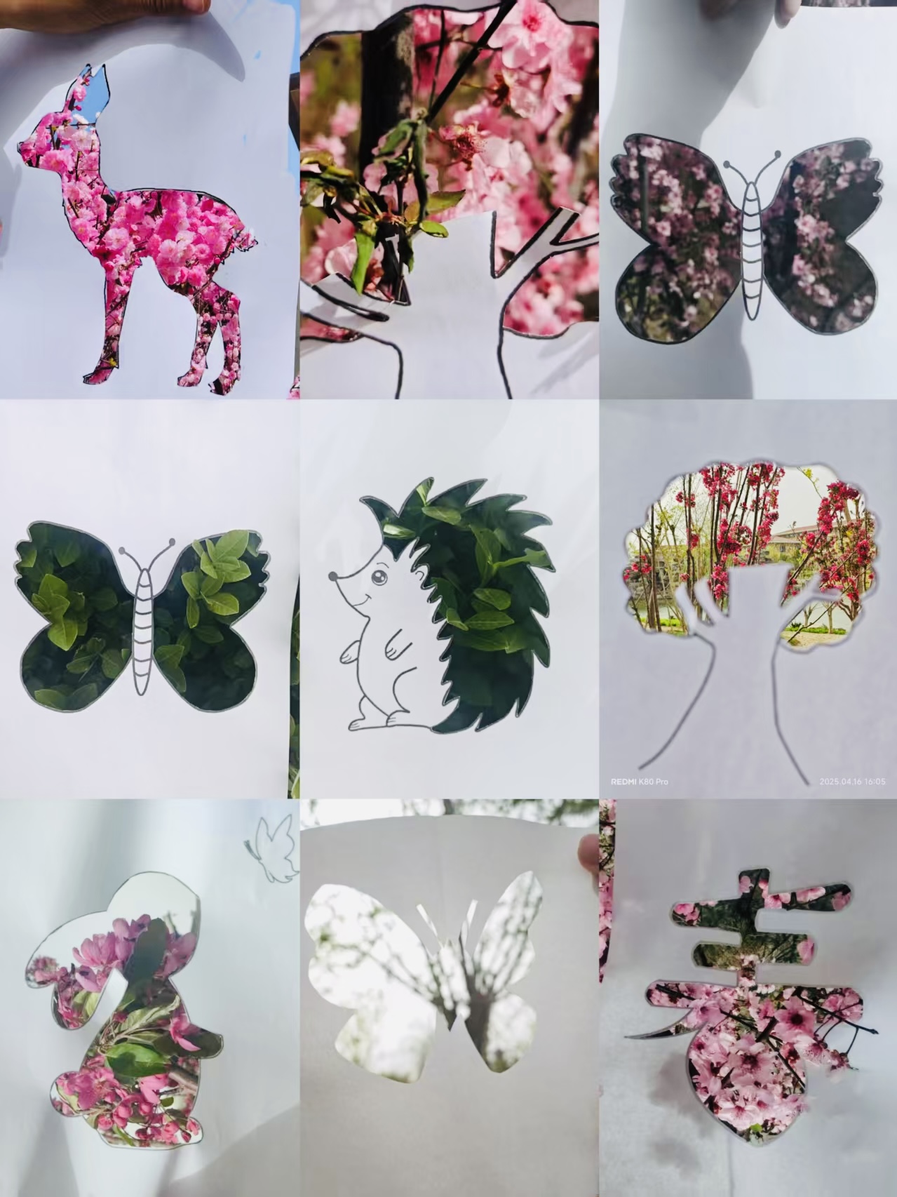 活动现场,同学们制作出“镂空”图纸,用无限创意捕捉春天的色彩。你看,大榕树戴上了“花团锦簇”的帽子,小蝴蝶拥有了“姹紫嫣红”的翅膀,小刺猬披上了“青翠欲滴”的外衣,小兔子穿上了“花繁叶茂”的裙子。这一幅幅妙趣横生的作品,是同学们对春天的诠释。